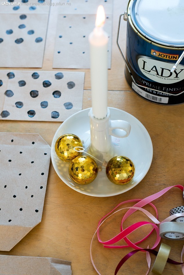 Poser fra Granit (kr 49,- for 10 stk), silkebånd og fløyelsbånd fra Søstrene Grene (fra kr 7,-). Lysestaken er fra IKEA. Julekulene og den gamle vinballongen er bruktkjøp. Lady Supreme Finish, superblank i fargen 9938 ”Dempet Sort” er brukt for å lage blanke fine prikker med en smal hobbypensel. Disse tørker på en kjapp time om du er nøye med å ikke legge på for mye maling.