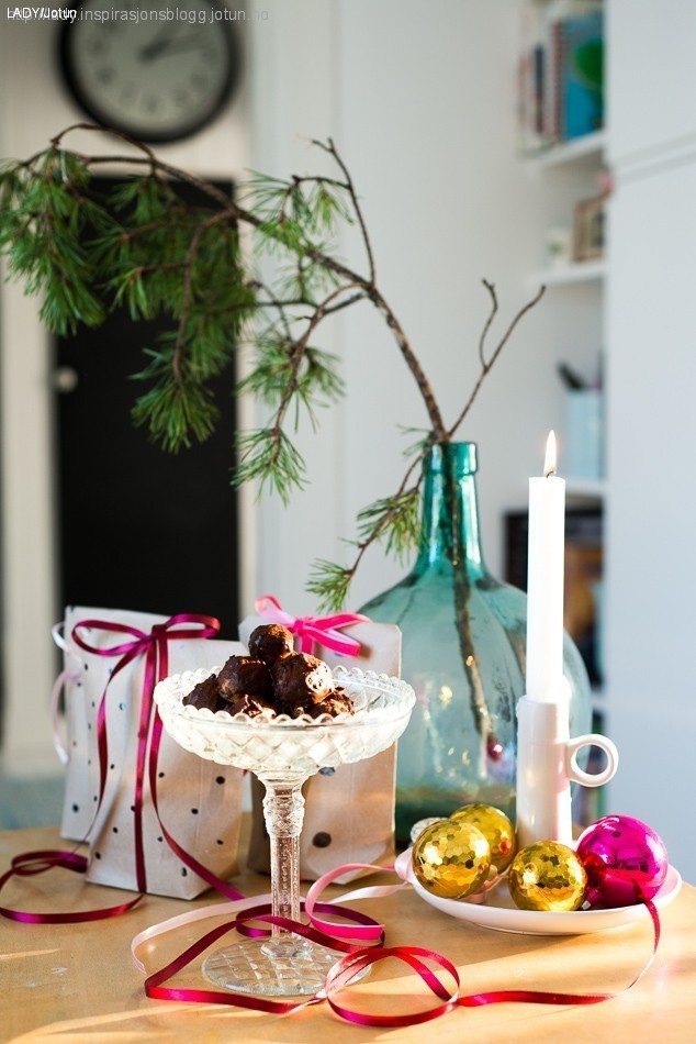 Innpakningen er jo halve moroa med å gi bort spiselige gaver! I år blir det gråpapirposer med påmalte prikker, og fint rosa silkebånd på mine pakker. Hvis ikke vi spiser opp alle Mozartkulene selv da…