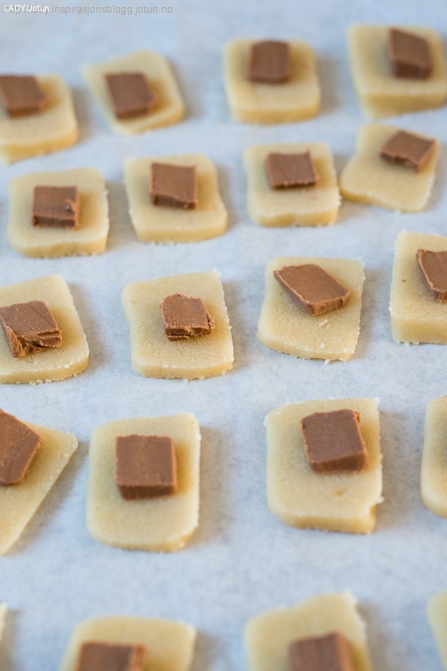 • Del nougaten på langs, og skjær deretter de to lengdene i små biter som plasseres midt på hver sin marsipanbit.