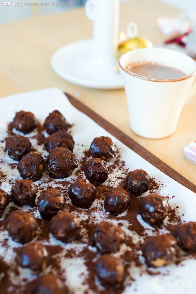 • Dypp kulene i sjokoladen, bruk en skje og en kakepinne til hjelp. Legg kulene tilbake på brettet og sikt en blanding av kakaopulver og kanel over sjokoladetrekket før det stivner.