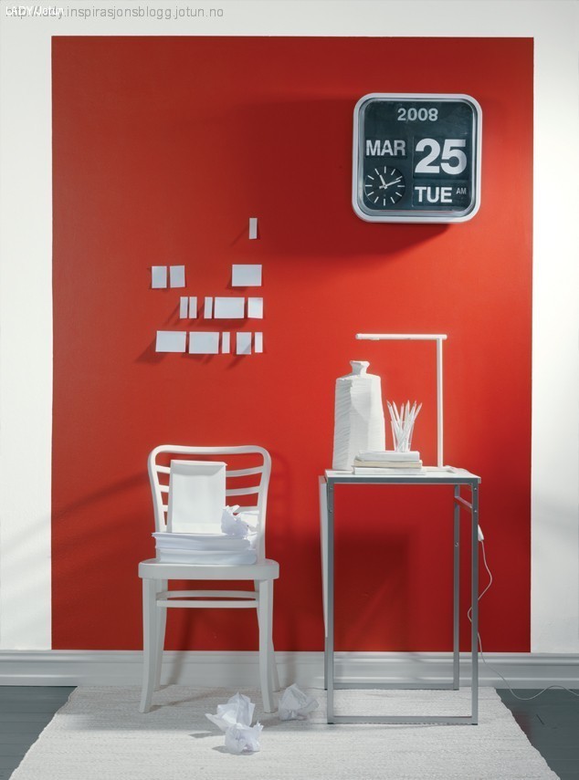 For de av dere som ikke har et eget rom til disposisjon, kan løsningen være å markere soner i interiøret ved hjelp av farger. Vi har her valgt å lage en liten arbeidsplass midt på en vegg, kun markert med en egen farge…..men ikke hvilken som helst farge, nemlig energi-kick-røde Lady 2452 Salsa. Effektivt og tøft, ikke sant?