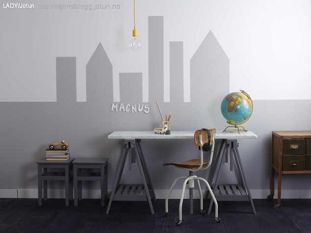 Ganske misunnelig på dette arbeidsrommet! Jeg vil også ha skyline på rommet mitt!! …drømme meg av gårde til New York… sukk… Dette maler du enkelt selv med hjelp av et vater, en god maskeringsteip og fine farger. Mål opp alle bygningene med vater og teip før du begynner å male. Viktig at du varierer høyden litt for å skape balanse i bilde. Vi har malt vårt rom med Sens 9915 Morgendis som basisfarge på vegg og Sens 9911 Nøytral på selve sky-linen. Krakkene er malt i Sens 9913 Matrix.