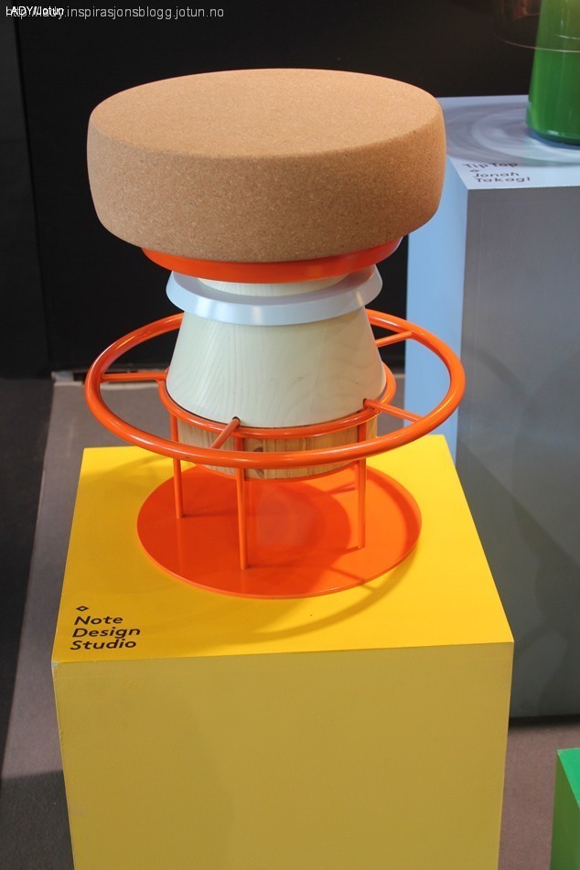 Vær så god og sitt! Note Design Studio viser sin variant av en krakk. Grafisk fargevalg i kombinasjon med naturlige innslag som kork og tre.